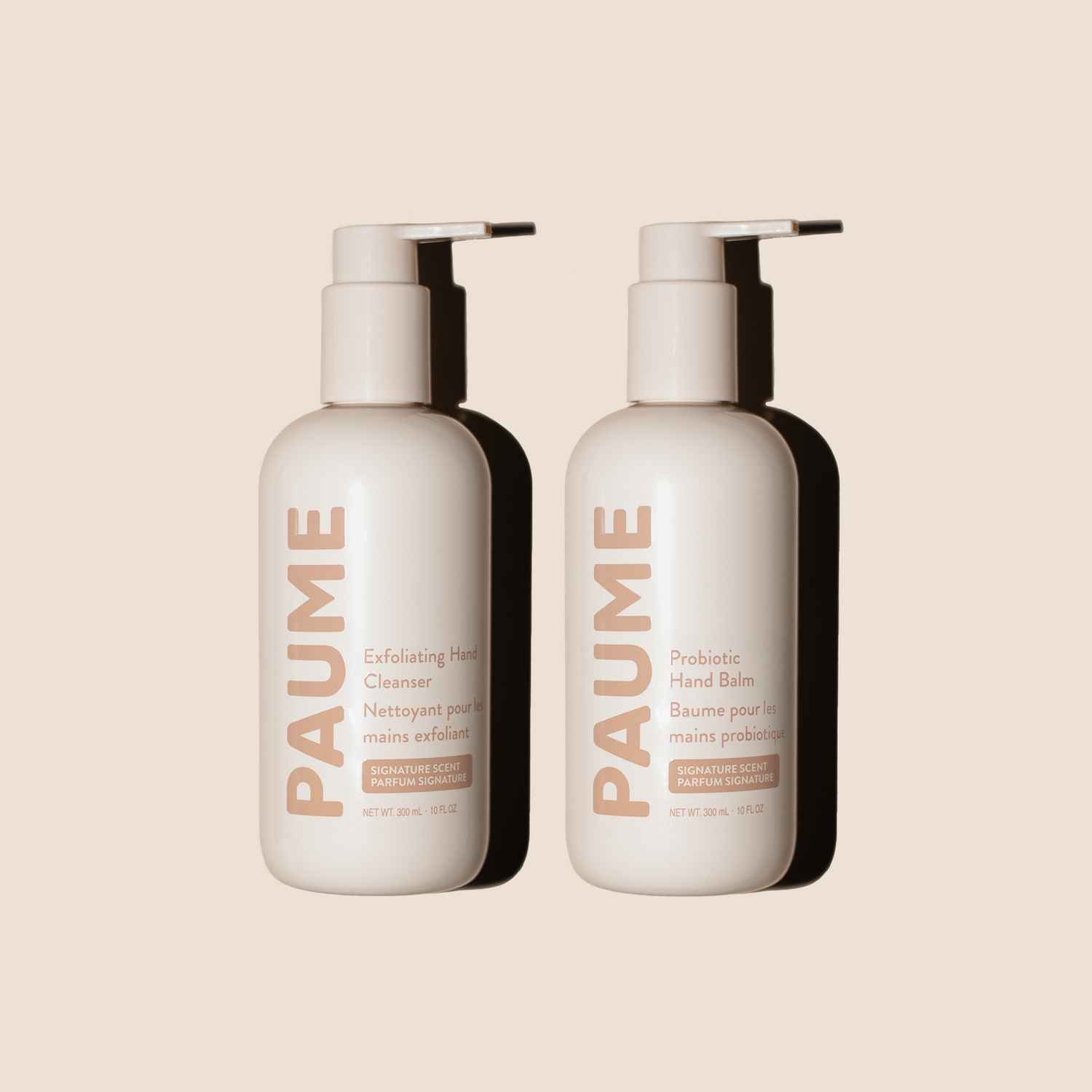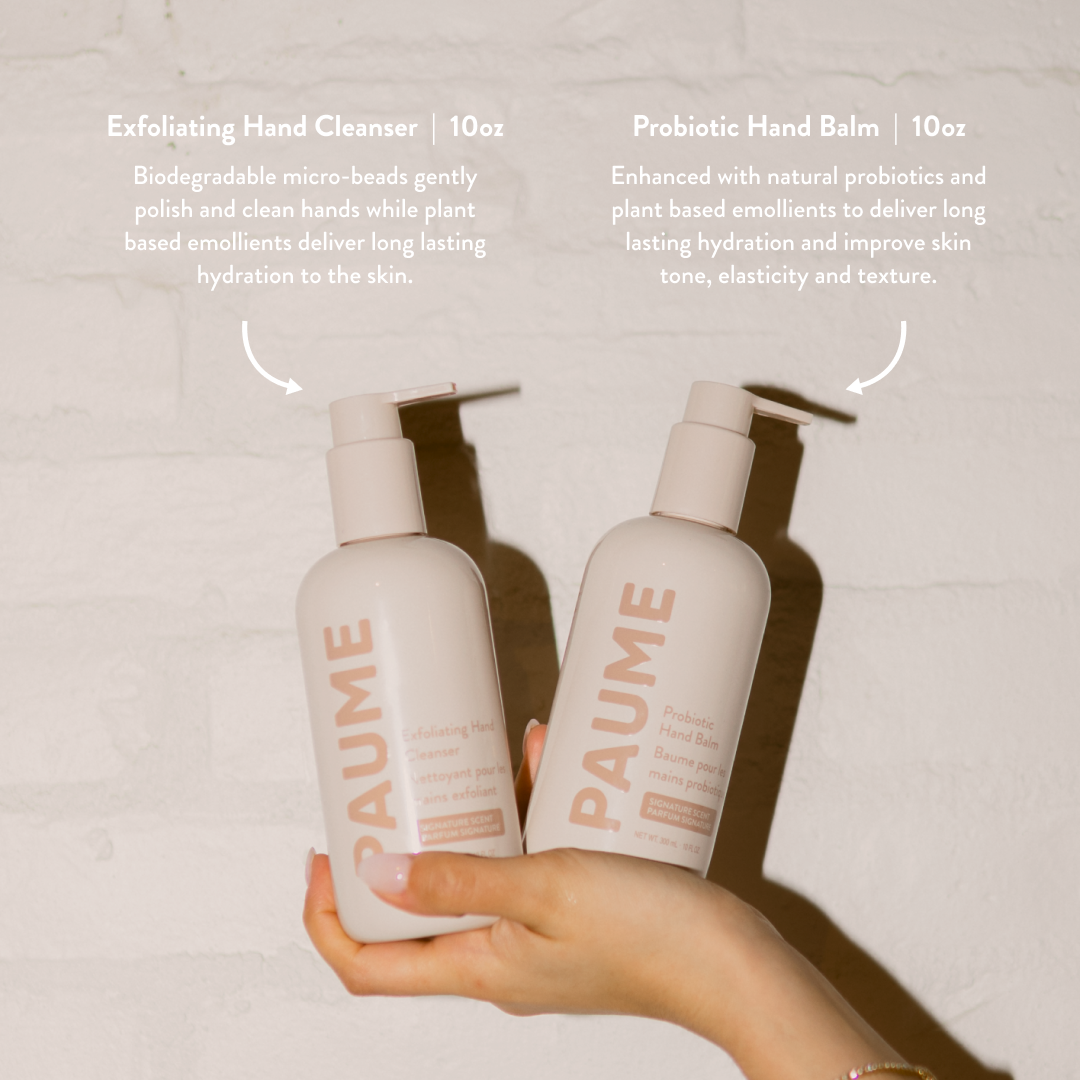 Transform your sink-side routine into a moment of indulgence with this elegant duo, crafted to give you and your guests the ultimate hand care experience. Experience gentle renewal with our Exfoliating Hand Cleanser, polishing away impurities, and hydrate with our Probiotic Hand Balm, a nourishing non-greasy formula that leaves you with soft, cared‑for hands.