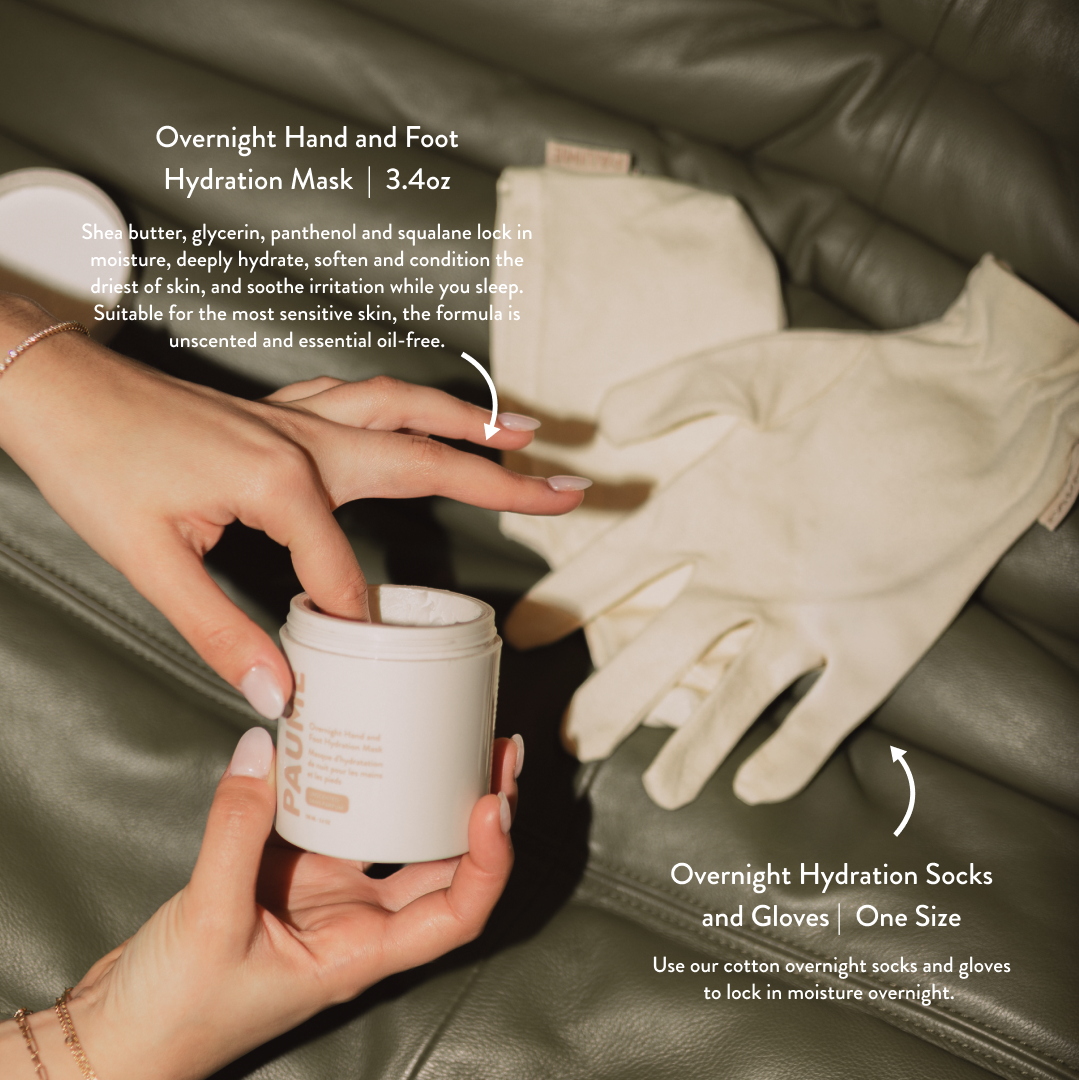 Treat yourself to the ultimate hydration treatment for your hands and feet. The Overnight Hand & Foot Mask locks in moisture, deeply hydrates, and softens and conditions the driest cracked hands and heels. Use the cotton overnight socks and gloves for optimal results while you sleep.