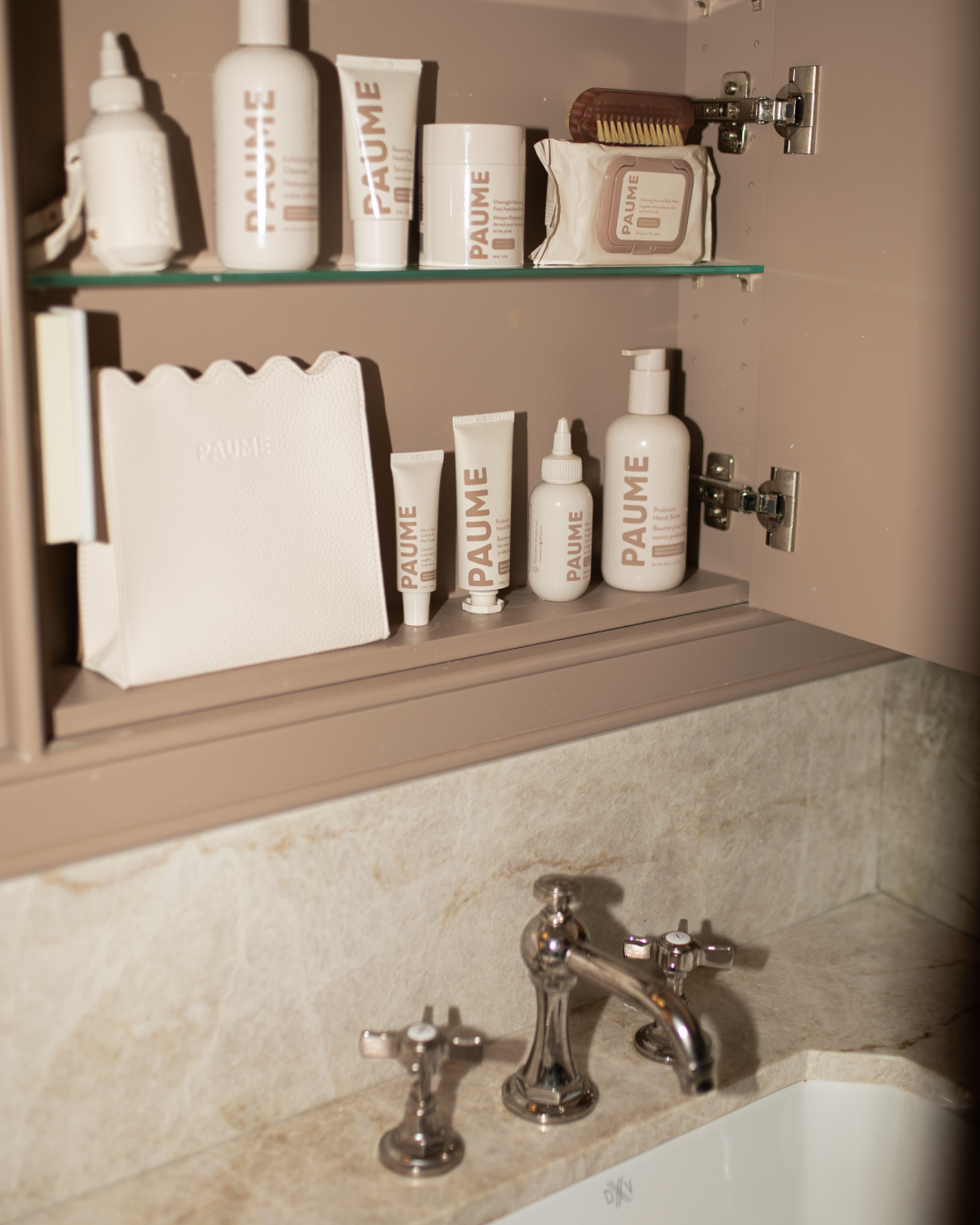 The PAUME Pouch is an elegant vegan leather carryall that keeps your hand care essentials organized. Soft to the touch and structured enough to hold its shape, it brings a touch of everyday luxury to your purse, bathroom, or bedside table.