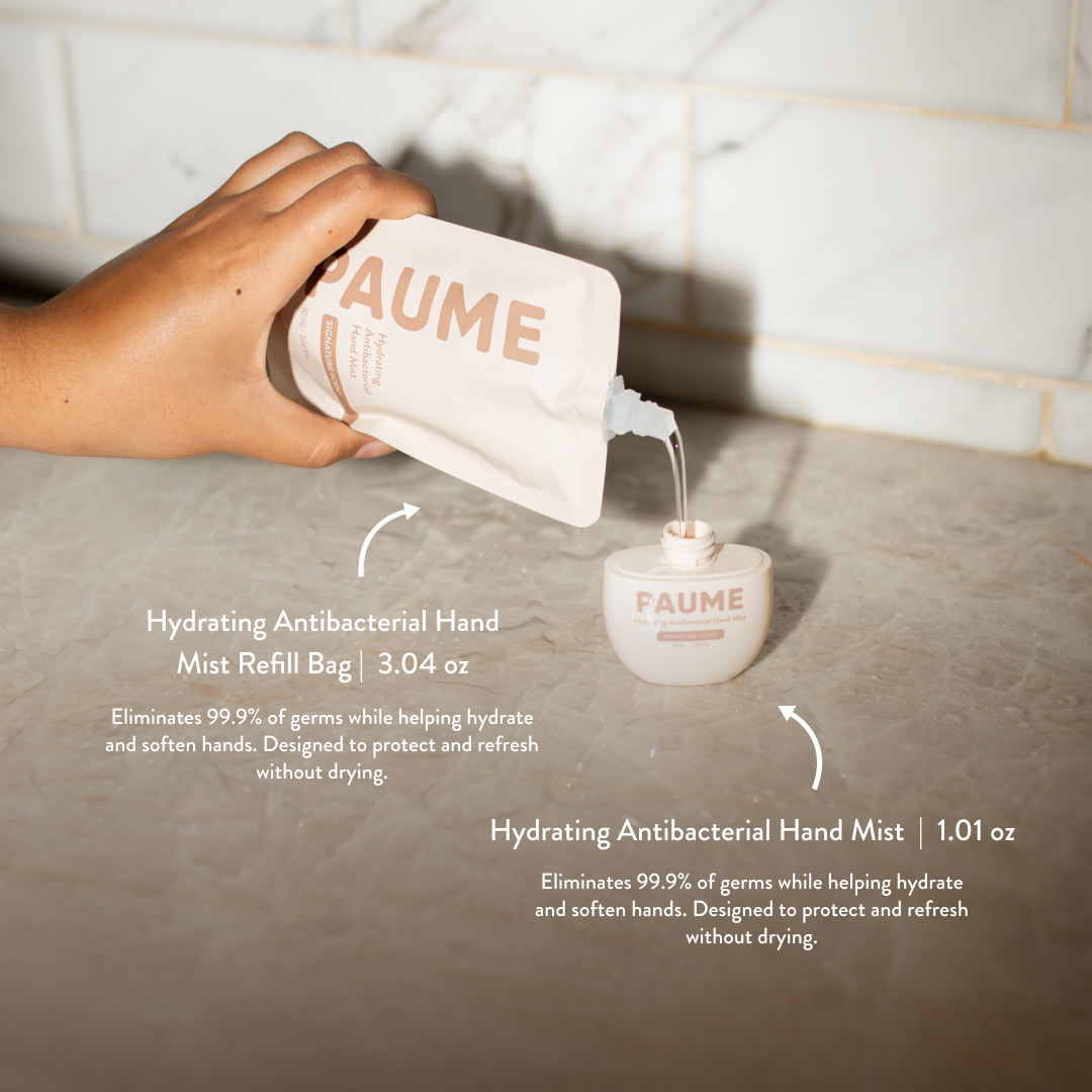 Sanitize with our Hydrating Antibacterial Hand Mist, proven to kill 99.99% of germs while niacinamide and aloe help hydrate, soothe, and support the skin barrier. The refill bag fills your bottle three times.